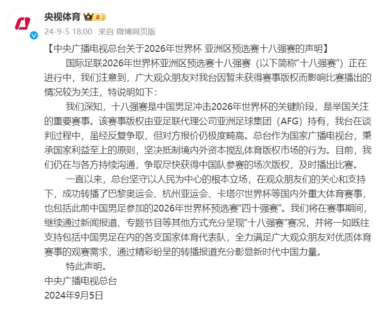 央视官方声明:深知18强赛重要性,虽反复争取但对方报价极度畸高