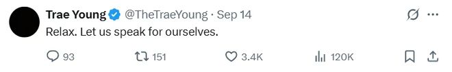 特雷·杨还嘲讽了贝弗利对胜利的反应:"我都不想说我们是怎么庆祝附加赛胜利的,我是在客场赢的附加赛,准备要打季后赛。你在主场赢的季后赛,站在技术台上搞得像夺冠了一样。"