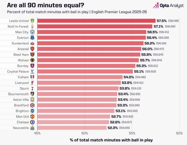 英超20队净比赛时间占比,纽卡切尔西曼联倒数前三