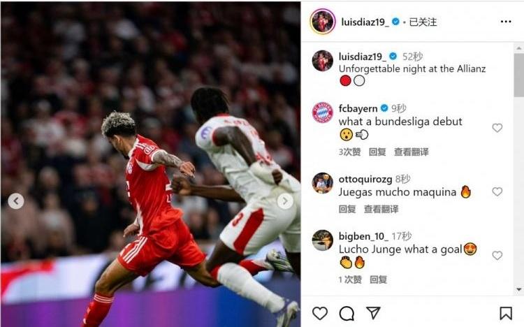 德甲首秀1射2传!迪亚斯社媒:安联球场的难忘夜晚