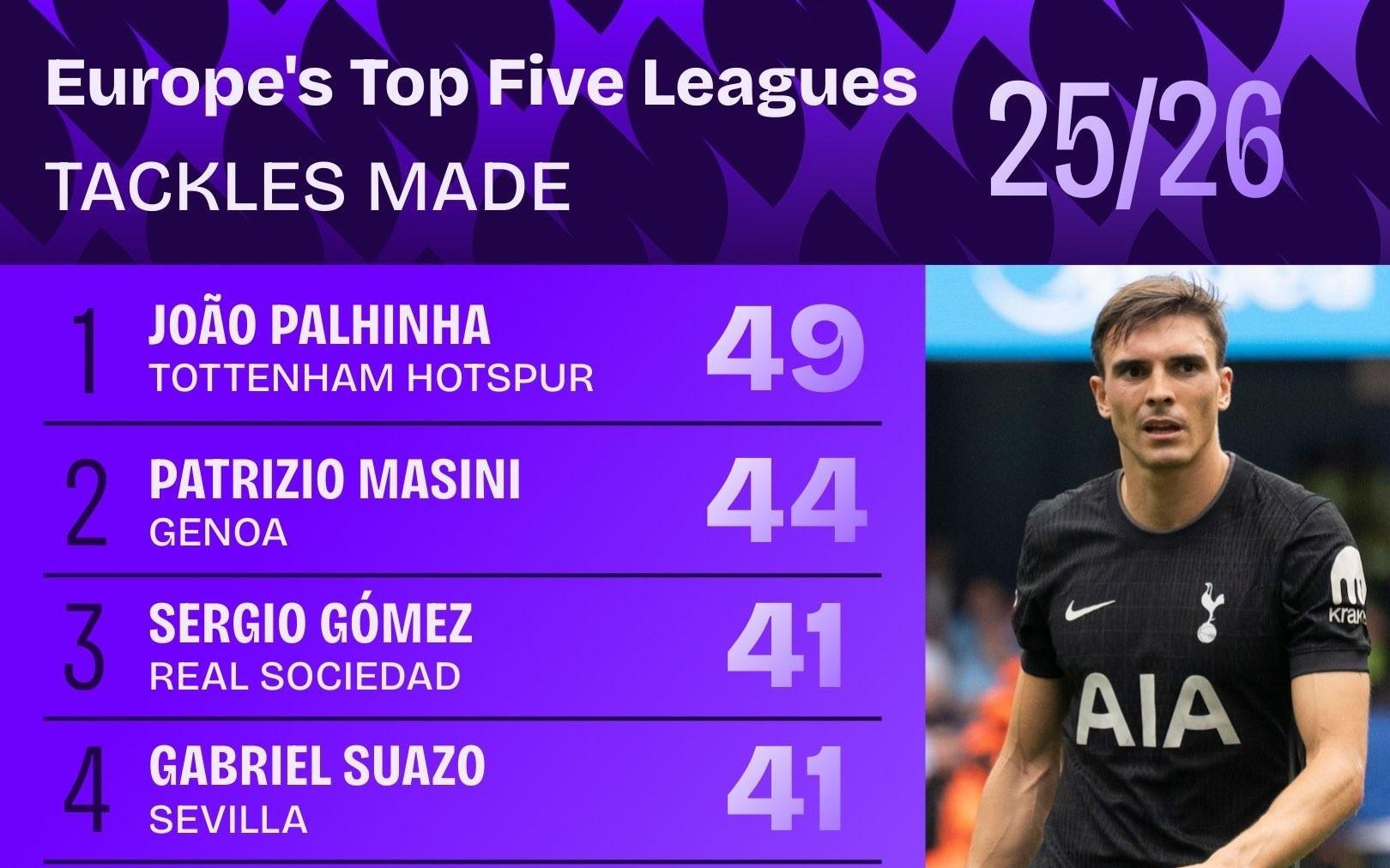 本赛季至今欧洲五大联赛抢断榜:帕利尼亚第49次第一