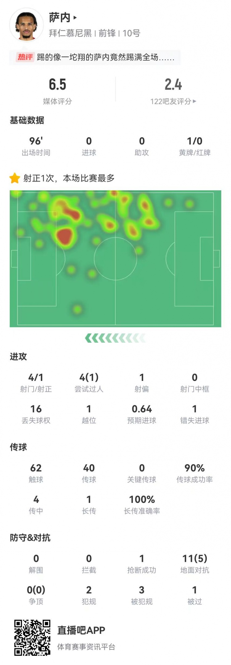 还续约吗萨内踢满全场,4传中0成功+4射1正+0关键传球1错失良机