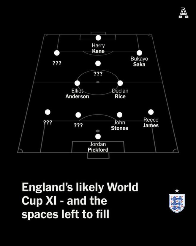 其中,皮克福德将是主力门将,里斯·詹姆斯是主力右后卫,斯通斯确定一个首发中卫位置;中场位置确定了赖斯、埃利奥特·安德森两个首发;前锋位置凯恩、萨卡稳坐首发。